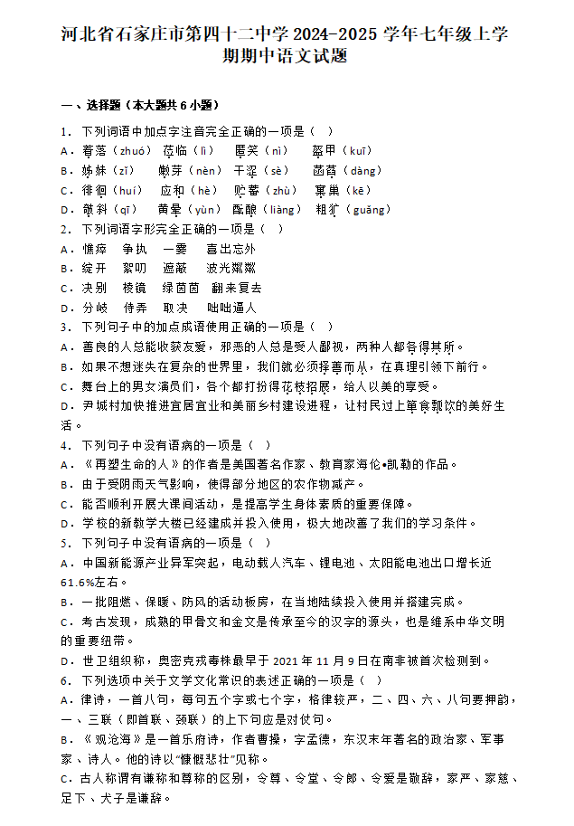 上一篇:重庆市西南大学附属中学校2024-2025学年七年级上学期期中语文试题