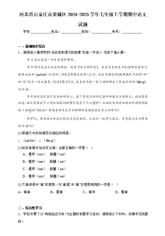 上一篇:河北省石家庄市第四十中学2024-2025学年七年级上学期期中语文试题