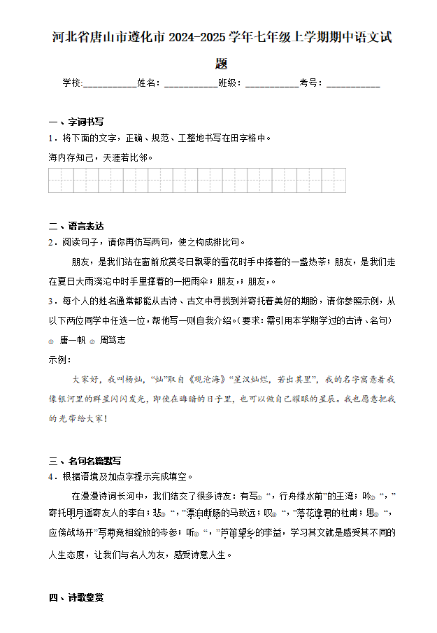 上一篇:河北省唐山市第五十四中学2024-2025学年七年级上学期期中语文试题