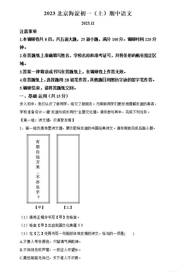 上一篇:北京市房山区2023-2024学年七年级上学期期中语文试题