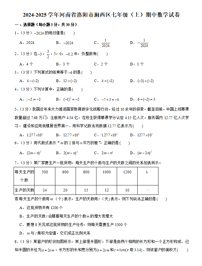 上一篇:2024-2025学年河南省安阳市七年级(上)期中数学试卷