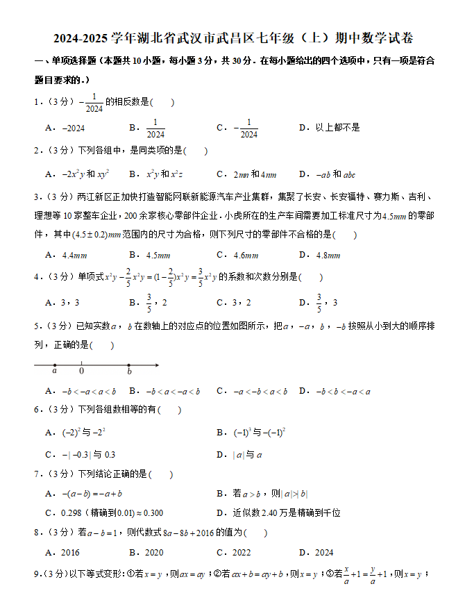上一篇:2024-2025学年湖北省武汉市江夏区、黄陂区、蔡甸区七年级(上)期中数学试卷