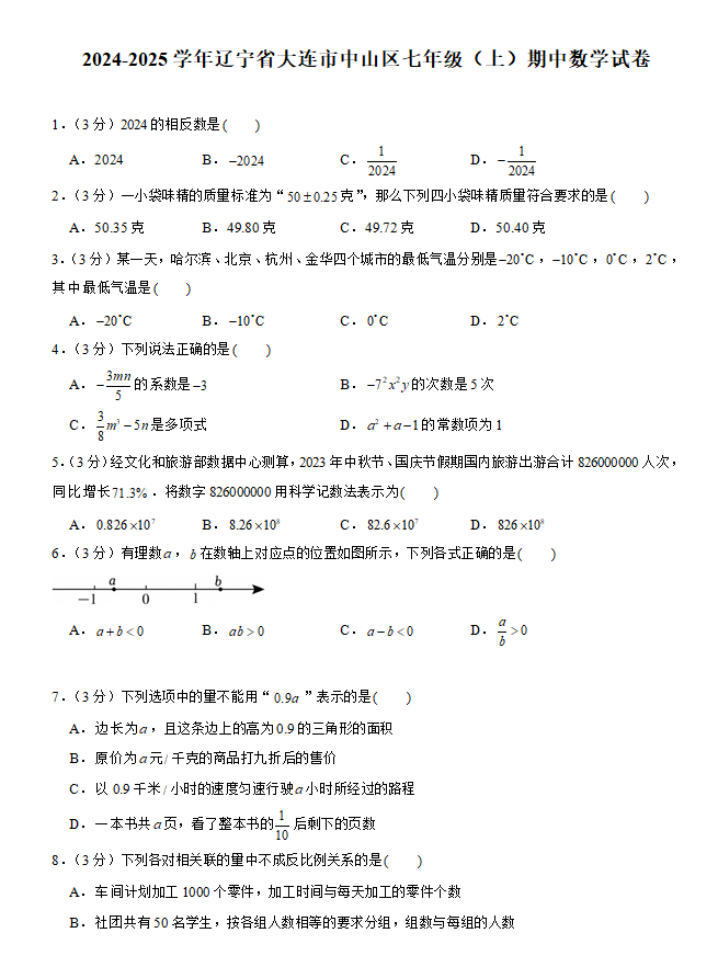 上一篇:2024-2025学年辽宁省大连市甘井子区七年级(上)期中数学试卷
