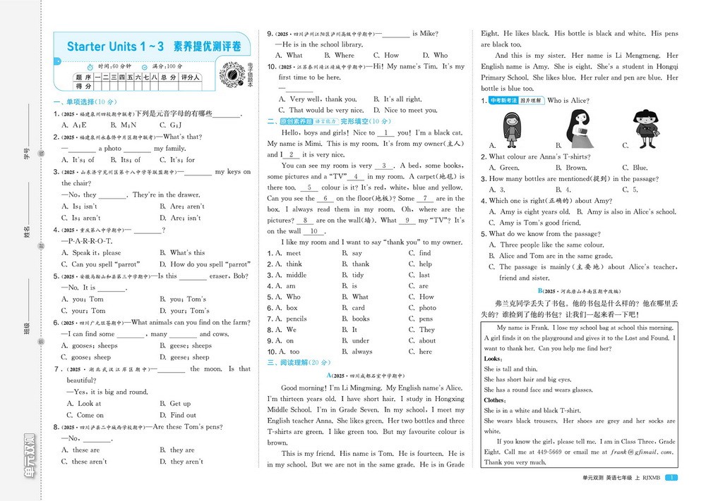 时间:120分钟 / 总分:120分/ 栏目:七年级英语上册2025-10-01 11:33:59