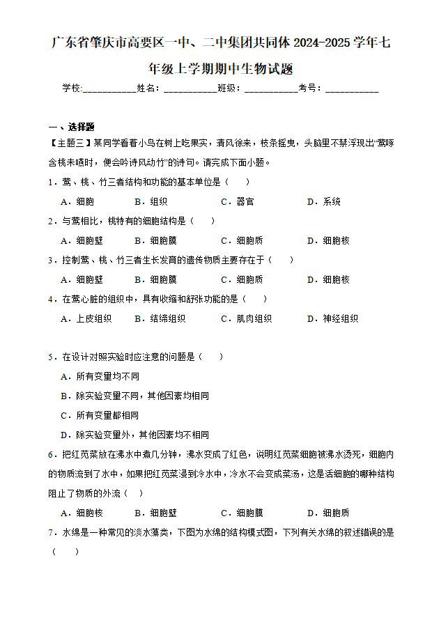 上一篇:广东省广州市第八十九中学2024-2025学年七年级上学期期中生物试题