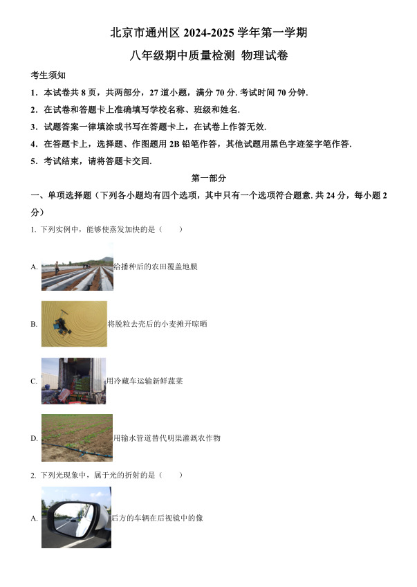 上一篇:北京市顺义区牛栏山第一中学实验学校2024-2025学年八年级上学期期中考试物理试题