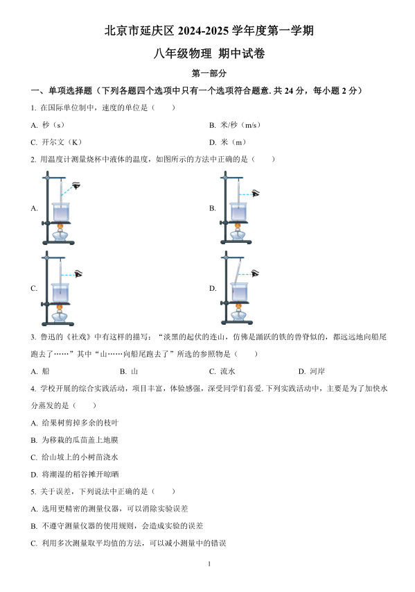 上一篇:北京市通州区2024-2025学年八年级上学期期中考试物理试题