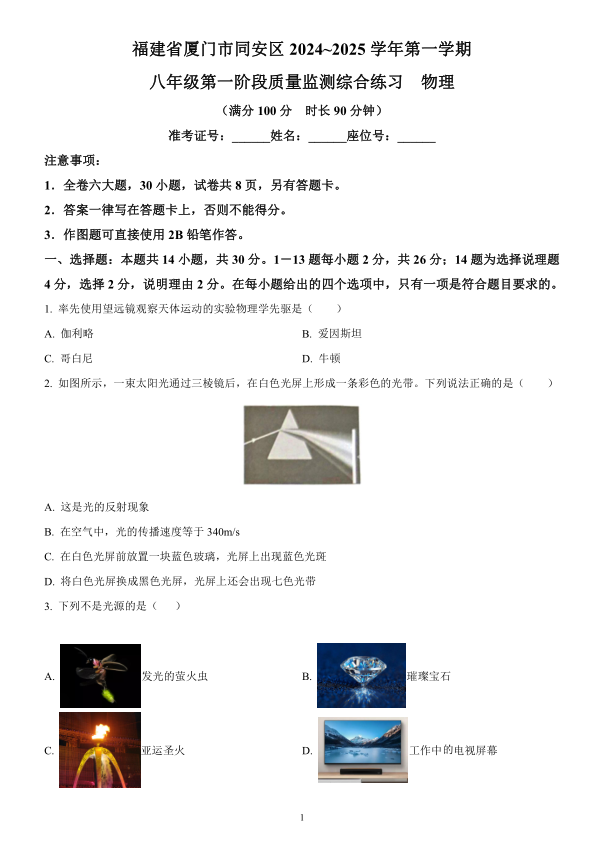上一篇:福建省三明市三元区2024-2025学年八年级上学期期中考试物理试题