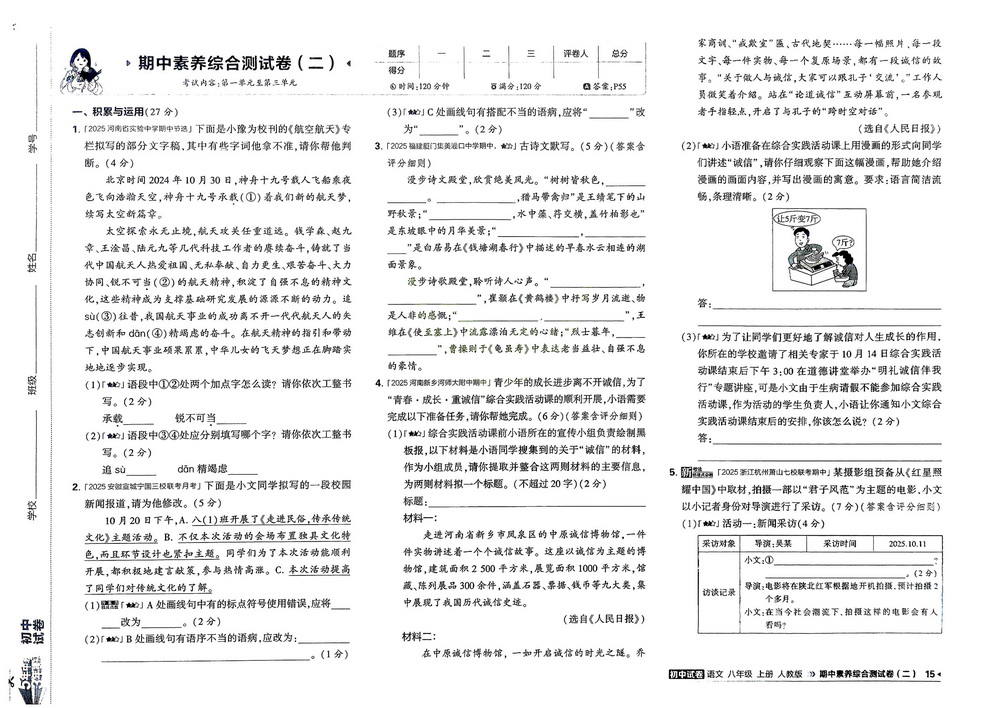 时间:120分钟 / 总分:120分/ 栏目:八年级语文上册2025-10-27 17:55:37
