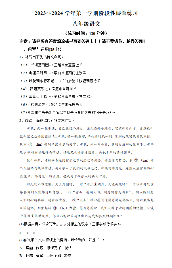 时间:120分钟 / 总分:120分/ 栏目:八年级语文上册2025-10-27 22:28:15