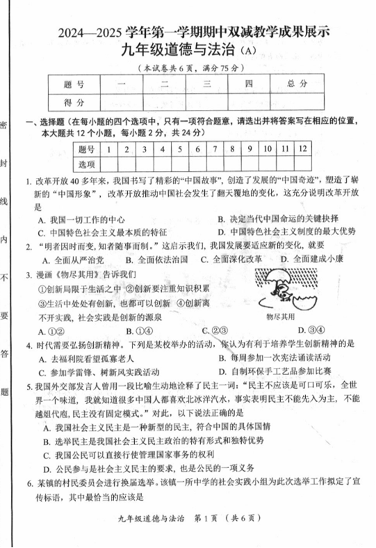 时间:120分钟 / 总分:120分/ 栏目:九年级道法上2025-10-29 17:28:22