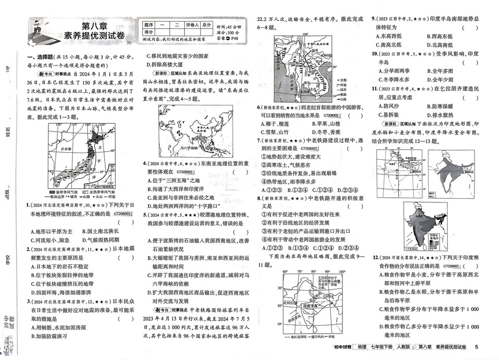 上一篇:新教材人教版七年级下册地理第八章测试卷七