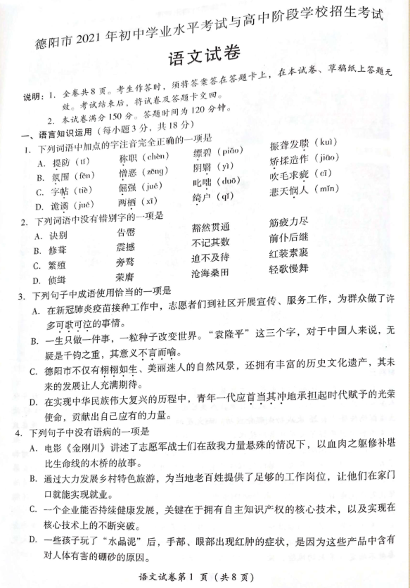 2021年四川省德阳市初中毕业学业水平考试语文试卷