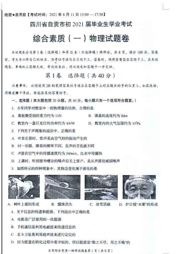 2021年四川省自贡市毕业生学业考试物理试题
