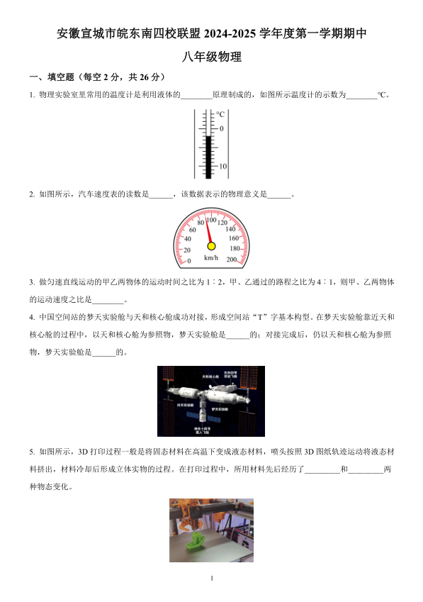 安徽省宣城市皖东南四校联盟2024-2025学年八年级上学期期中物理试题