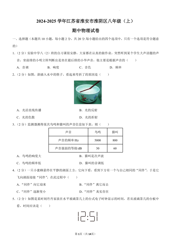 2024-2025学年江苏省淮安市淮阴区八年级上学期物理期中试卷
