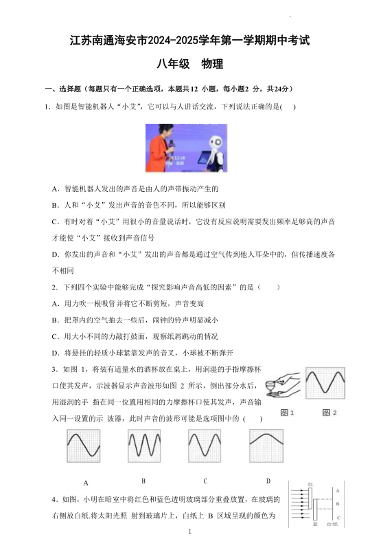 2024-2025学年江苏省南通市海安市八年级上学期物理期中试卷
