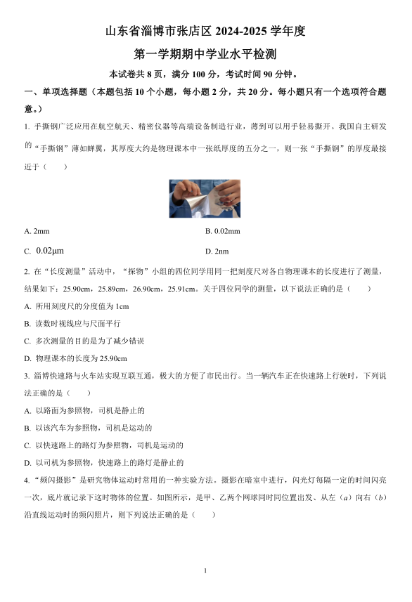 山东省淄博市张店区2024-2025学年八年级上学期期中考试物理试题