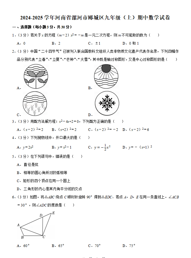 2024-2025学年河南省漯河市郾城区九年级(上)期中数学试卷