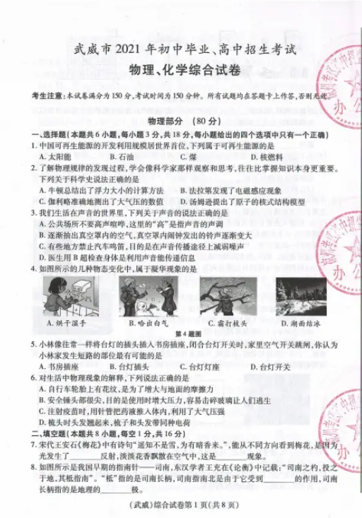2021年甘肃武威市初中毕业生学业考试物理试题