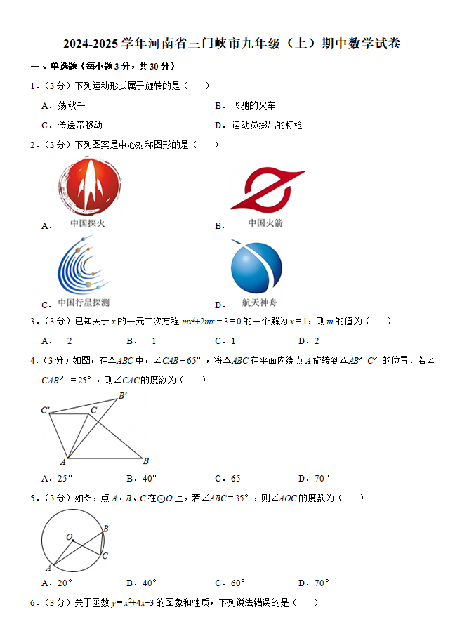 2024-2025学年河南省三门峡市九年级(上)期中数学试卷