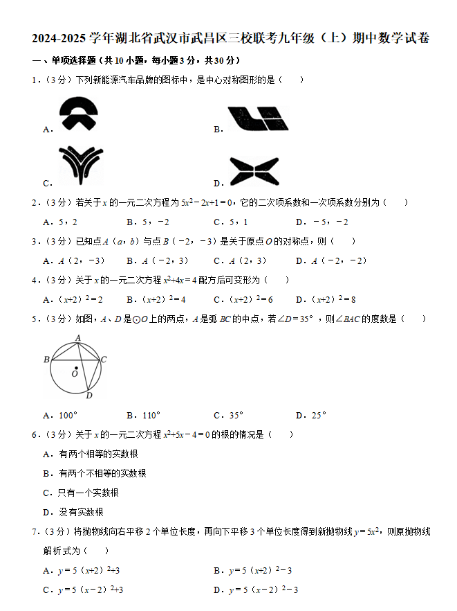 2024-2025学年湖北省武汉市武昌区三校联考九年级(上)期中数学试卷