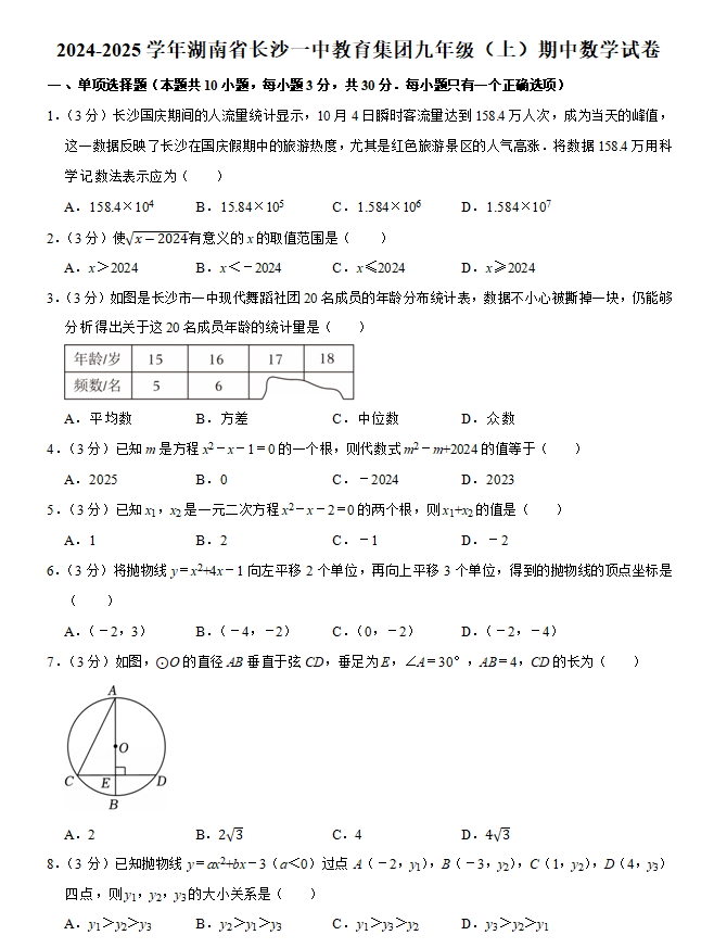 2024-2025学年湖南省长沙一中教育集团九年级(上)期中数学试卷