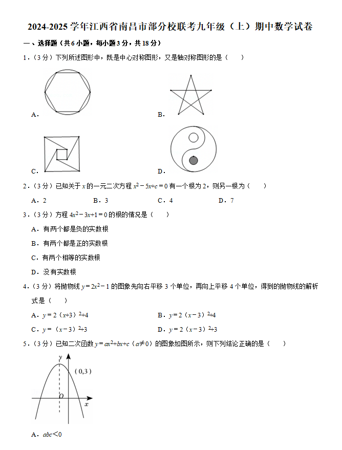 2024-2025学年江西省南昌市部分校联考九年级(上)期中数学试卷