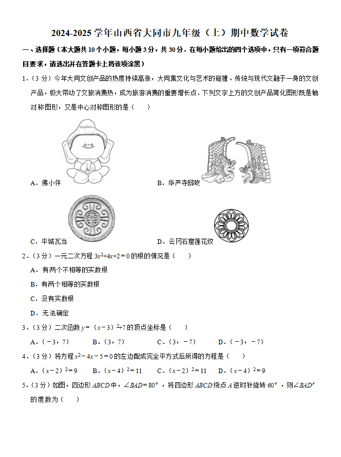 2024-2025学年山西省大同市九年级(上)期中数学试卷