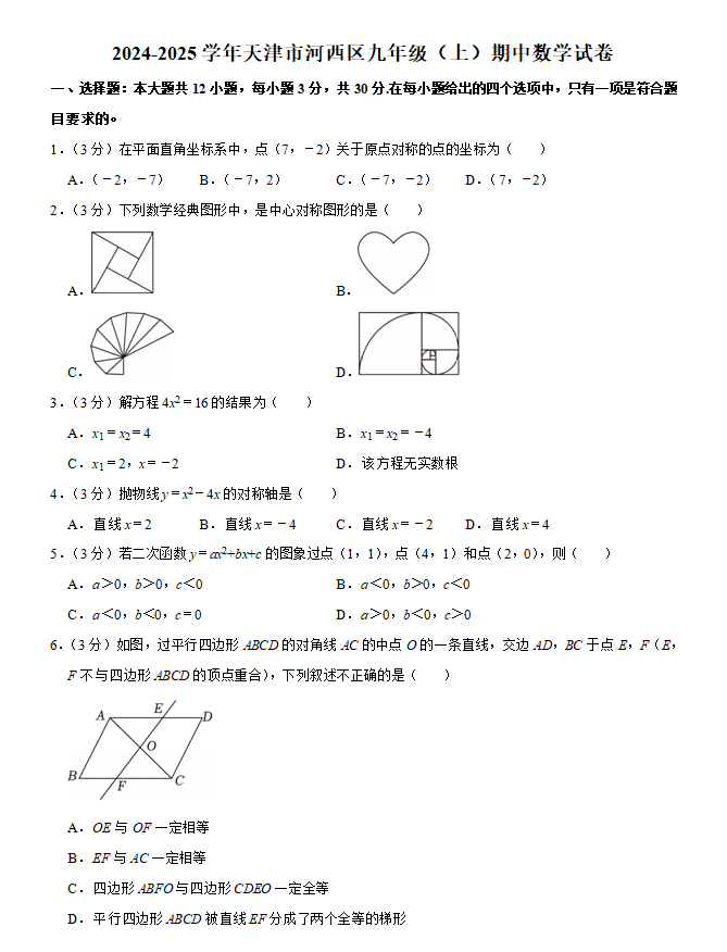 2024-2025学年天津市河西区九年级(上)期中数学试卷