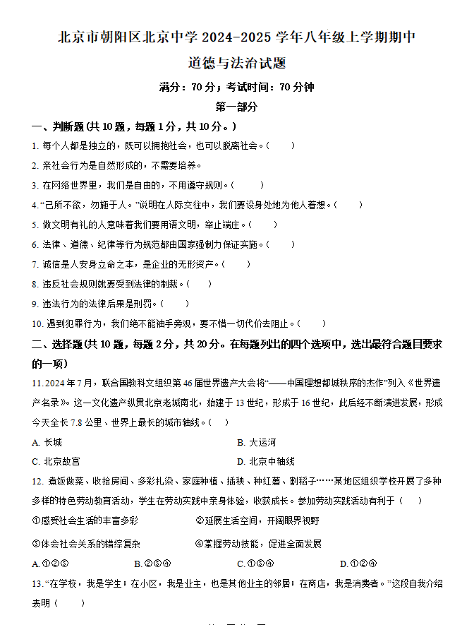 北京市朝阳区北京中学2024-2025学年八年级上学期期中道德与法治试题