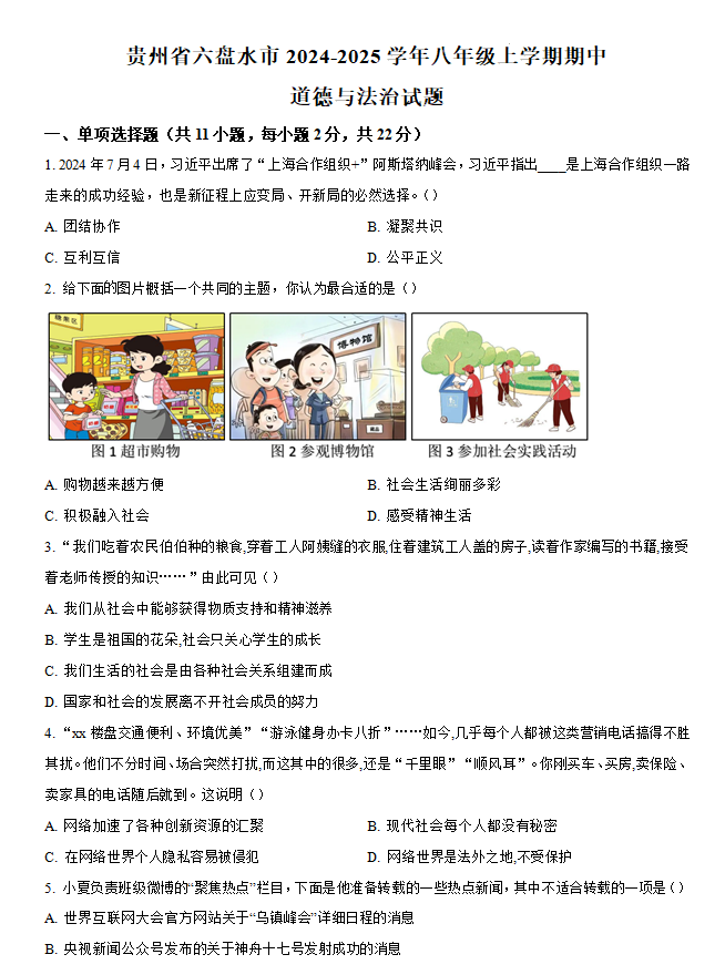 贵州省六盘水市2024-2025学年八年级上学期期中道德与法治试题