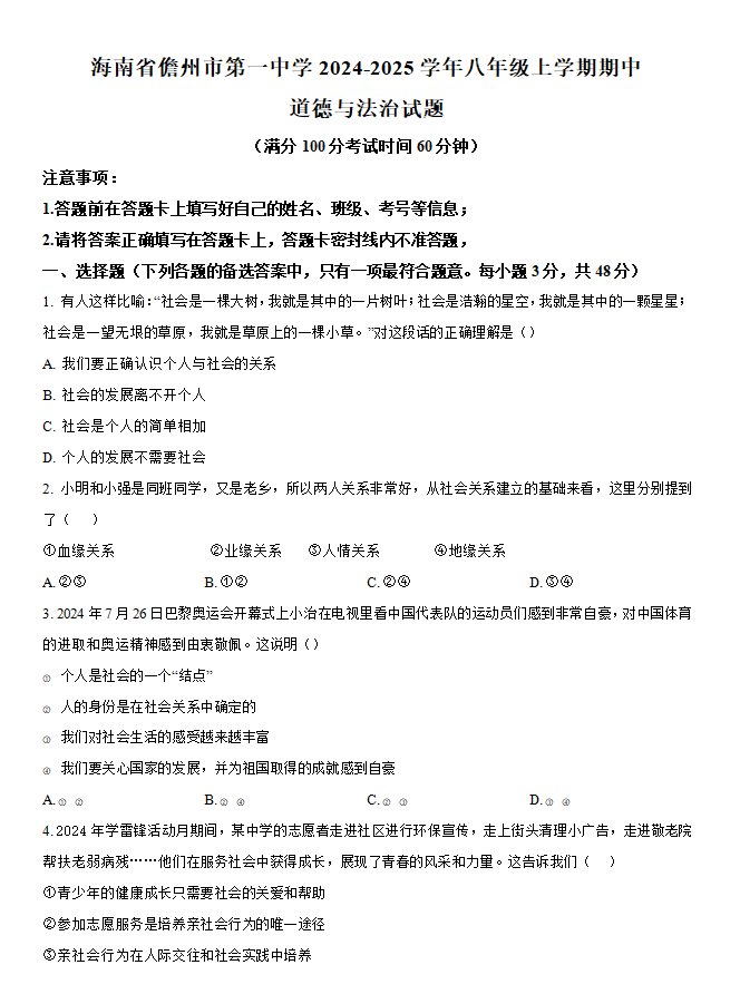 海南省儋州市第一中学 2024-2025学年八年级上学期期中道德与法治试题