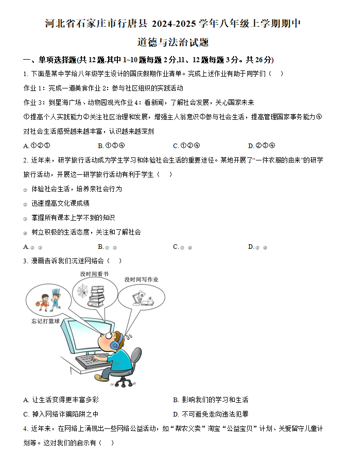 河北省石家庄市行唐县 2024-2025学年八年级上学期期中道德与法治试题