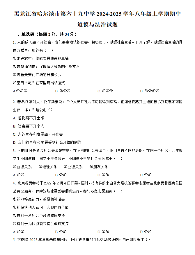 黑龙江省哈尔滨市第六十九中学 2024-2025学年八年级上学期期中道德与法治试题
