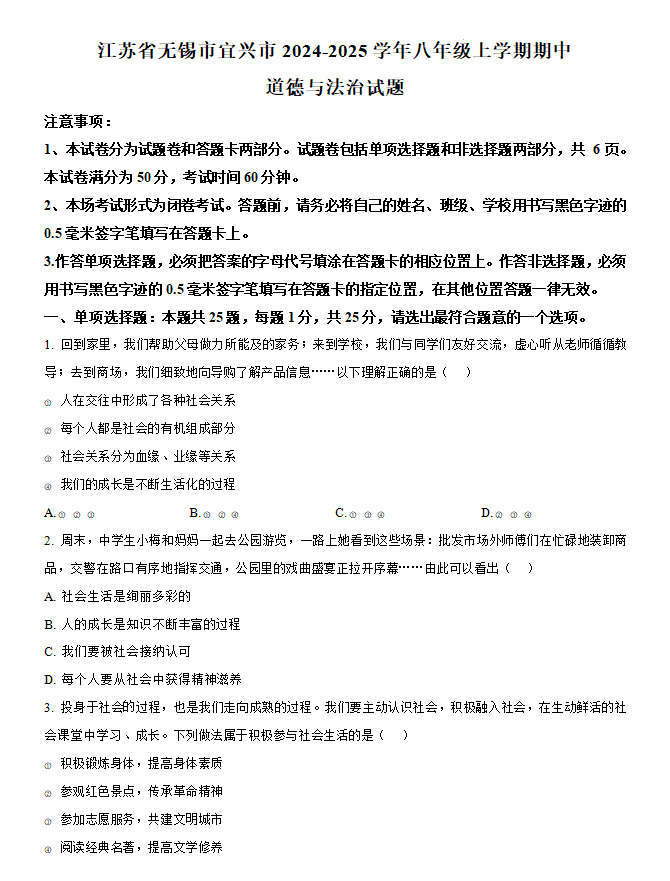江苏省无锡市宜兴市2024-2025学年八年级上学期期中道德与法治试题