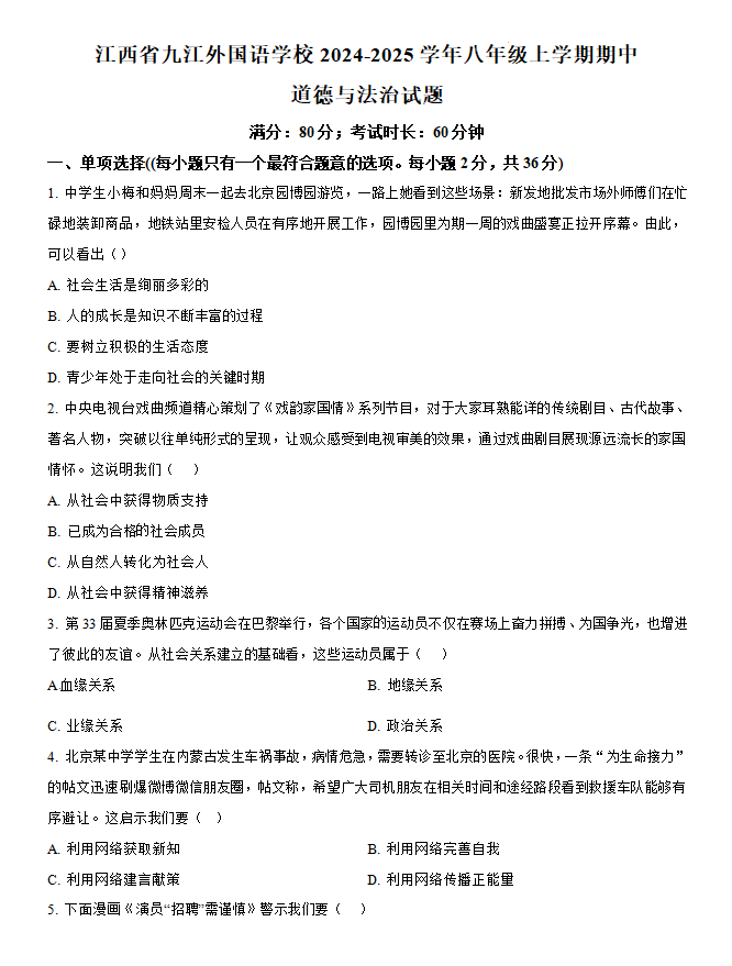江西省九江外国语学校2024-2025学年八年级上学期期中道德与法治试题