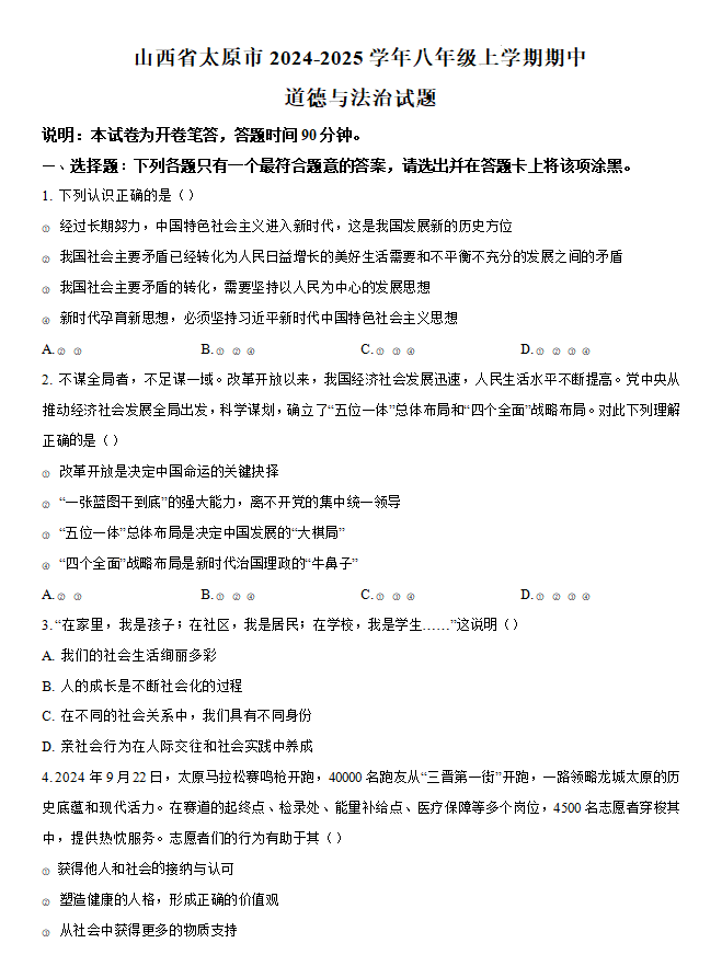 山西省太原市2024-2025学年八年级上学期期中道德与法治试题