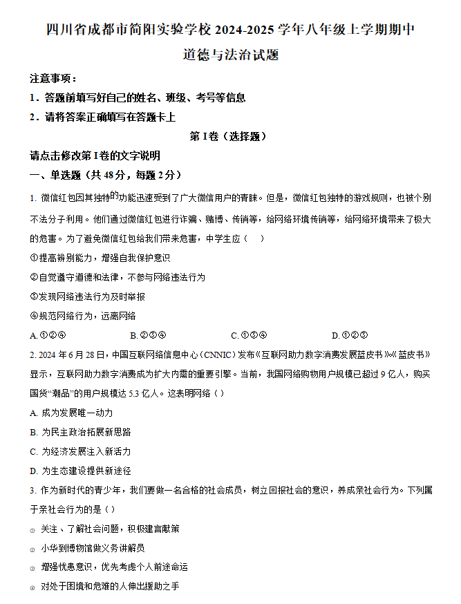 四川省成都市简阳实验学校2024-2025学年八年级上学期期中道德与法治试题