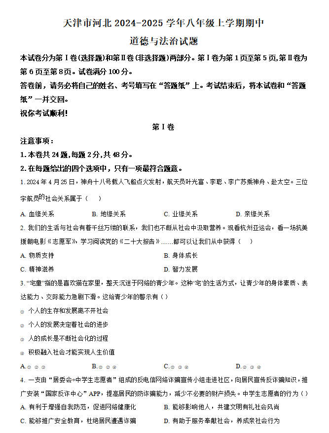 天津市河北区 2024-2025学年八年级上学期期中道德与法治试题