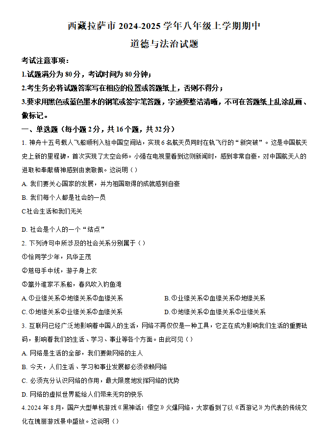 西藏拉萨市2024-2025学年八年级上学期期中道德与法治试题