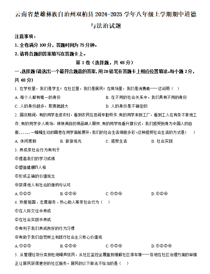 云南省楚雄彝族自治州双柏县2024-2025学年八年级上学期期中道德与法治试题