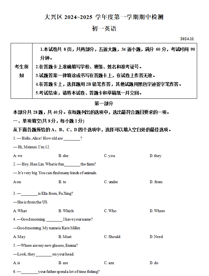 北京市大兴区2024-2025学年七年级上学期期中英语试题