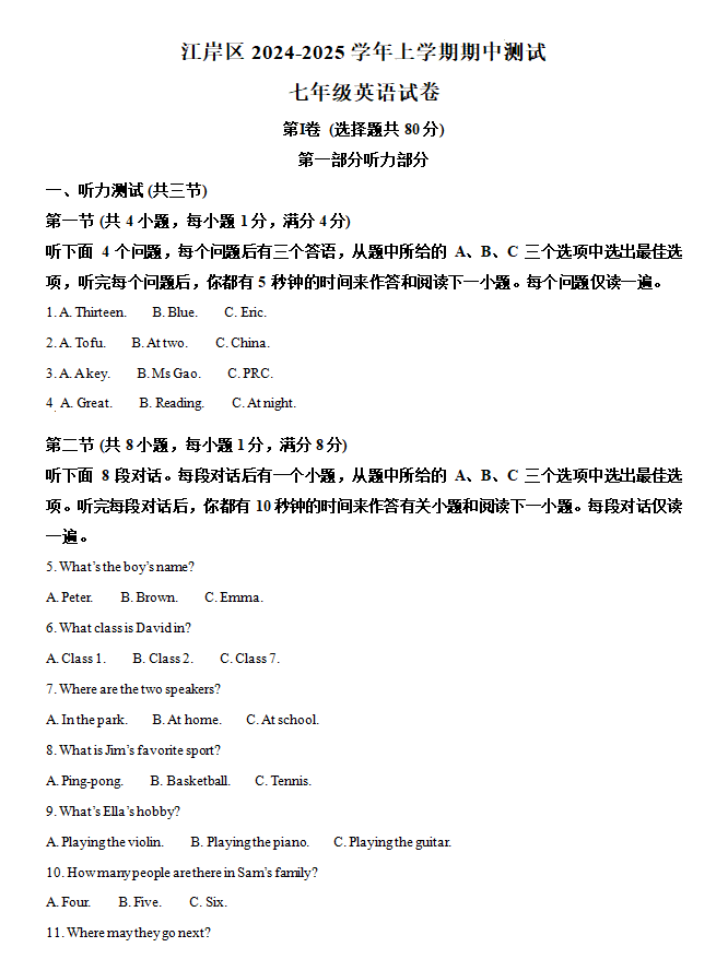 湖北省武汉市江岸区2024-2025学年七年级上学期期中英语试题
