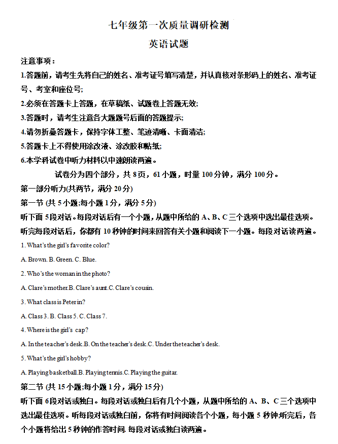 上一篇:湖北省武汉市江岸区2024-2025学年七年级上学期期中英语试题
