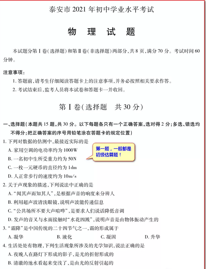 2021年山东泰安市初中毕业生学业考试物理试题