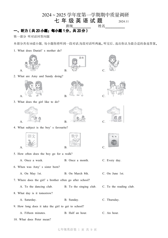 重庆市南开中学校2024-2025学年七年级上学期期中英语试题