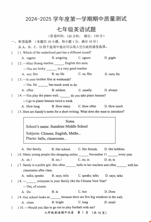 重庆市南开中学校2024-2025学年七年级上学期期中英语试题
