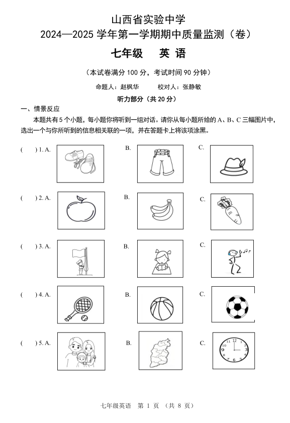 山西省实验中学2024-2025学年七年级上学期期中测试英语试题