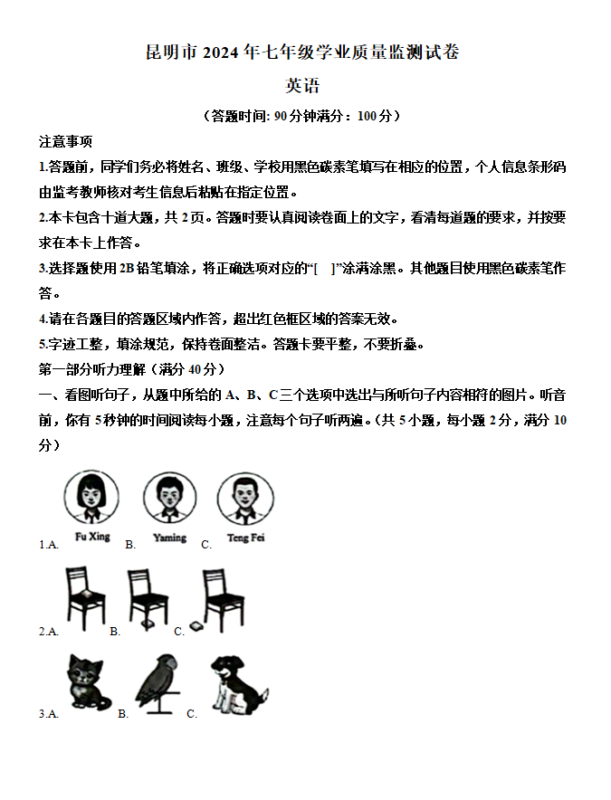 云南省昆明市2024-2025学年七年级上学期期中英语试题